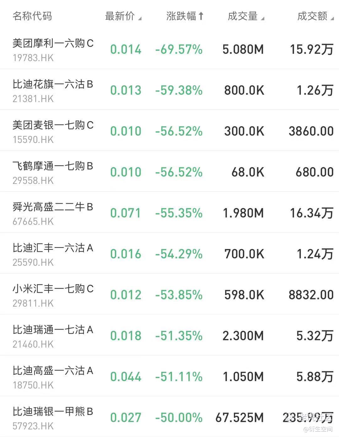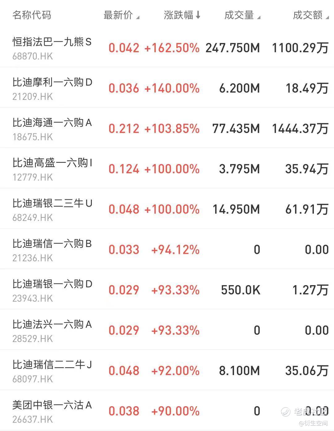 涨幅居前的包括:恒指法巴一九熊S暴涨162.50%;比迪摩利一六购D涨140.00%。