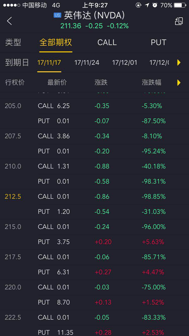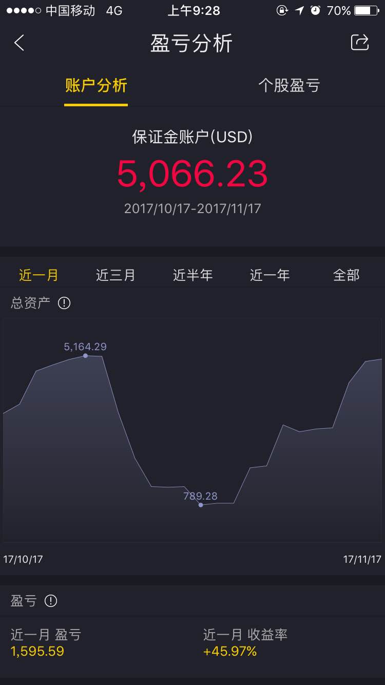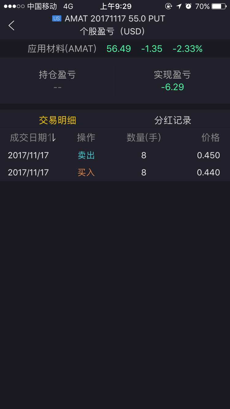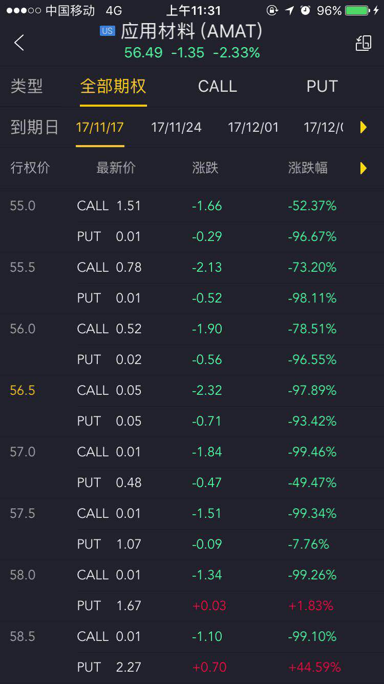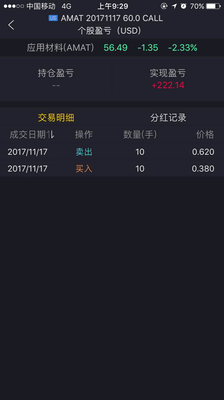 说说自己本周操作,最大的收获是操作AMAT财报。由于看好AMAT财报,在11月16号我同时买入了11月17末日call和put,买入后两个期权同时上涨,因为考虑了5%区间,所以买的60call和55put,60call成本0.39元,11点半之后成交量急剧放大,一路将期权价格推升到0.65元,同时put也开始涨。这时候我整体盈利约220元(本金一共700元),收益率31%。我再次查看AMAT历次财报走势,发现他每季度不管财报好坏都表现平平,另外市值很大,有600多亿,并且估计不高,只有57元左右。我果断平仓了,用掉两次T+0,但是昨天财报后走势证明我做对了,如果未卖出,那么本金700元将全部亏完。这个例子再次证明了我总结的牛市赌财报的正确方法:选择好热门股,财报前15天提前买入,财报前一天卖出,胜率超过80%!