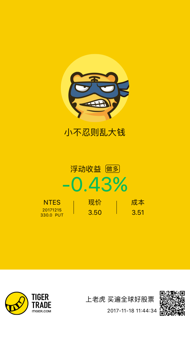 最后讲讲目前的持仓,由于网易财报超预期大涨(所谓的超预期或不如预期都是华尔街说了算),朋友说两天涨了70亿美元,涨了网易几年利润,我结合前面多次大涨后走势,在收盘时买了12月330元标准put。很多人说不可能跌到那么多,在这里我再次重复上篇帖子个人对于期权的理解:期权是我们期望获得的一种权益。所以只要在12月15日之前,网易跌了不少或者大跌一天,哪怕距离330元行权价较远,我仍然可以获得收益,在到我目标收益后,我将获利卖出。另外由于之前说的特斯拉、京东双杀,导致IV降低了很多,加上我看好特斯拉及京东未来一个月走势,买了他俩看涨期权。目前昨天买入的三只期权都暂时亏损,但是我会继续坚持,不会再重蹈百度覆辙。