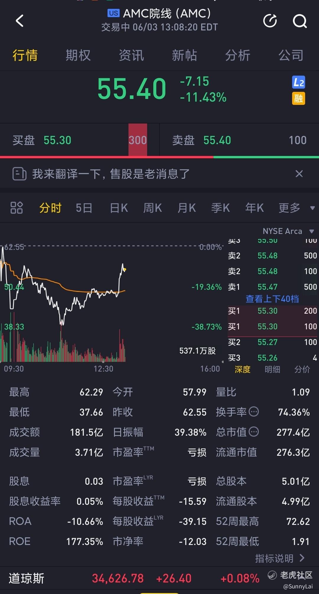 今天AMC盘前首两小时的欢腾,老司机都知道这是来自东方的赌徒们,趁着华尔街大鳄们还没睡醒空档期的骗炮之举,不该用于主盘时段的走势参照。果然,开盘狂泄,茅坑里跳远 —— 过分了。蹦跶得差不多了,开盘后一个半小时,44.57元,入场吧!