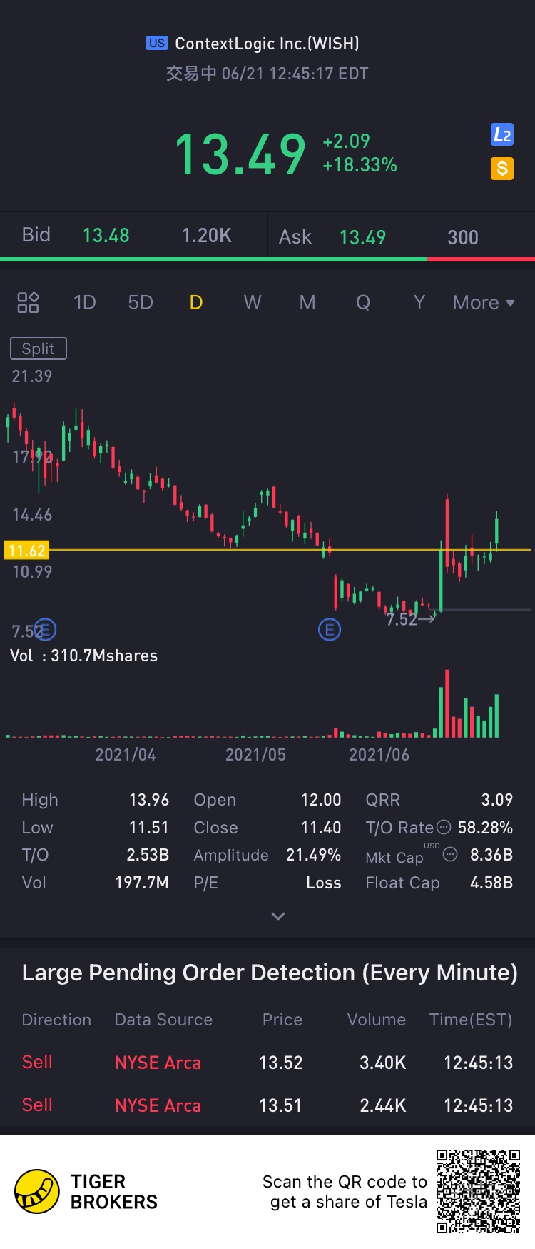 $ContextLogic Inc.(WISH)$caught my attention today [Surprised] , price open above my resistance line, so look good for me and manage to buy during market open… [Cool] still consider early involvement after reversal… May have good run to 20 at least… [Miser]