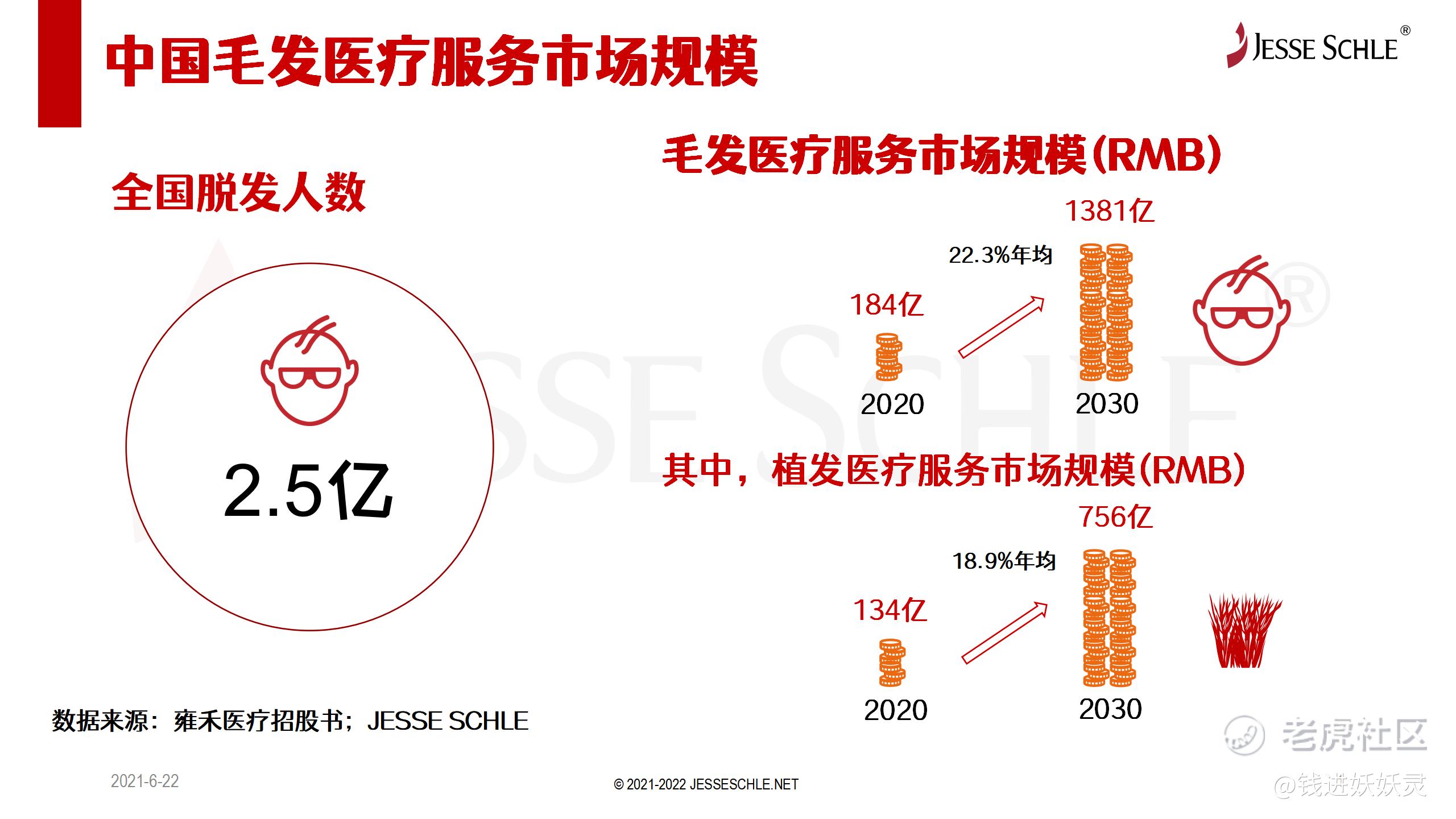 根据雍禾医疗招股书里引用的数据,全国有2.5亿人患有脱发,而整体毛发医疗服务市场在2020年达到184亿人民币的规模,并预计将以22.3%的年均复合增长率于2030年达到1381亿人民币的规模。其中,植发医疗服务市场将会以18.9%的年均复合增长率从2020年的134亿的规模到2030年的756亿的规模。