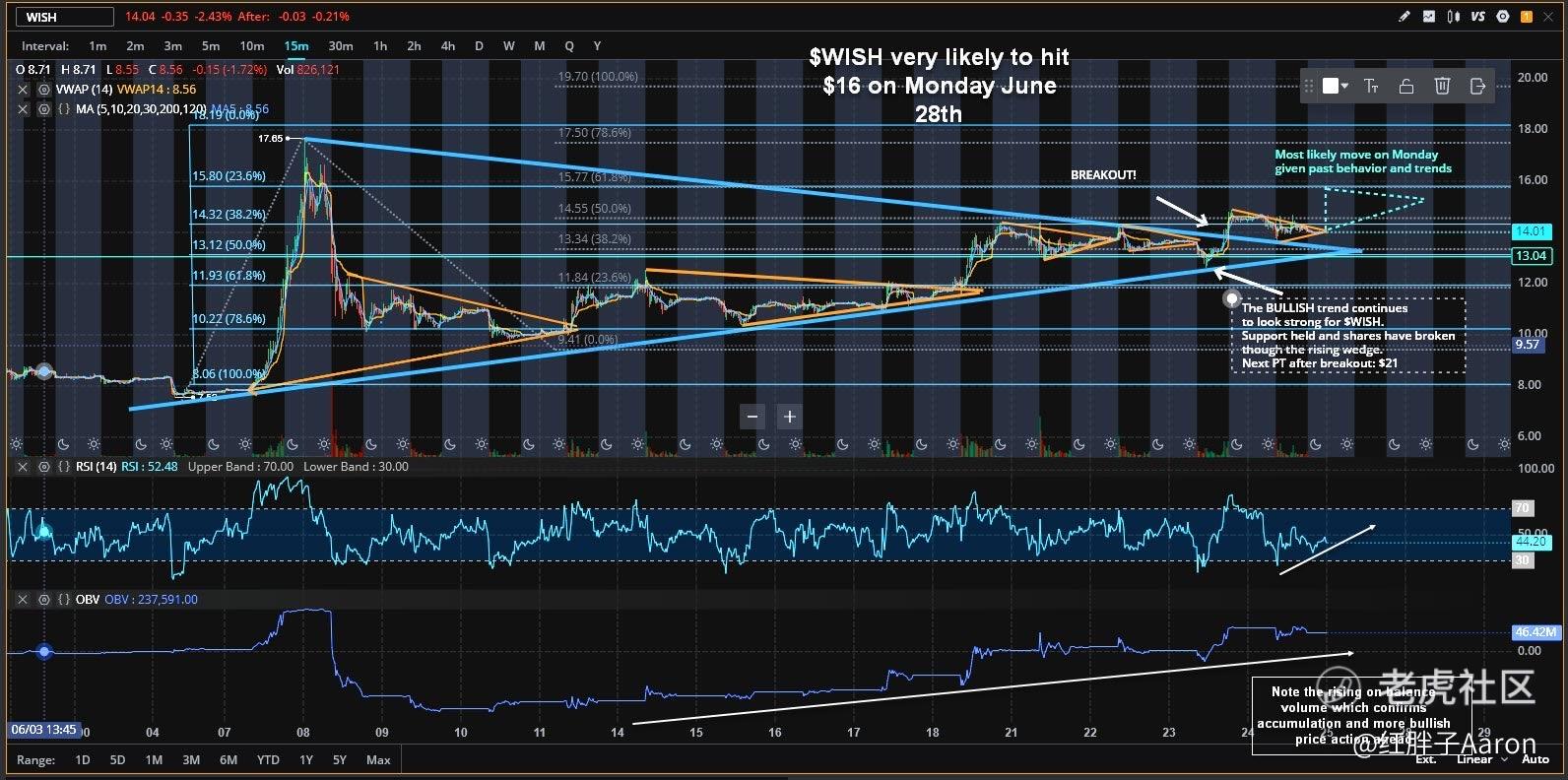 周四时候,SpotGamma 在社交媒体上告诉他的粉丝 WISH 会迎来一个GammaSqueeze (暴涨),鉴于期权交易员认为 WISH 的股价要高得多,并且购买的看涨看涨合约远多于看跌期权,因此出现了很多不期权异动。以下是一张详细的技术图表,基于技术突破、分形和体积,该图标暗示该股在下周一会突破16美元大关。
