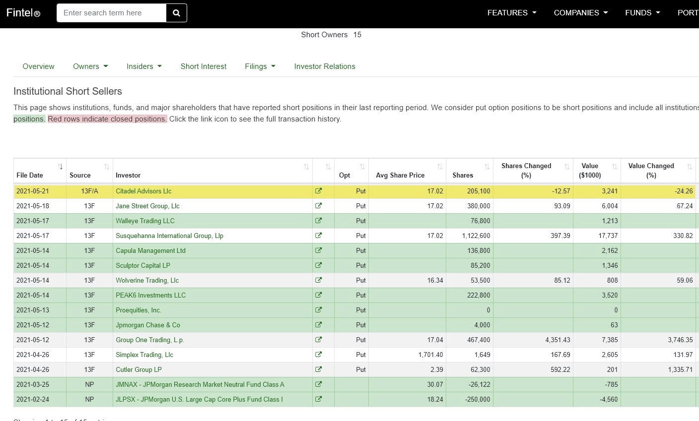 据最新报道,延迟的 13-F文件实际上表明 Citadel Advisors、Jane Street Group, Llc、Susquehanna International、PEAK6 Investments LLC 和 Group One Trading, L.p 是在上一个报告期内的一些最大的做空 $ContextLogic Inc.(WISH)$ 的对冲基金。看起来 Citadel 已经开始回补 12.57%的头寸,但随着股价跌破 17美元的区间,其他空头公司则猛扑并做空更多。
