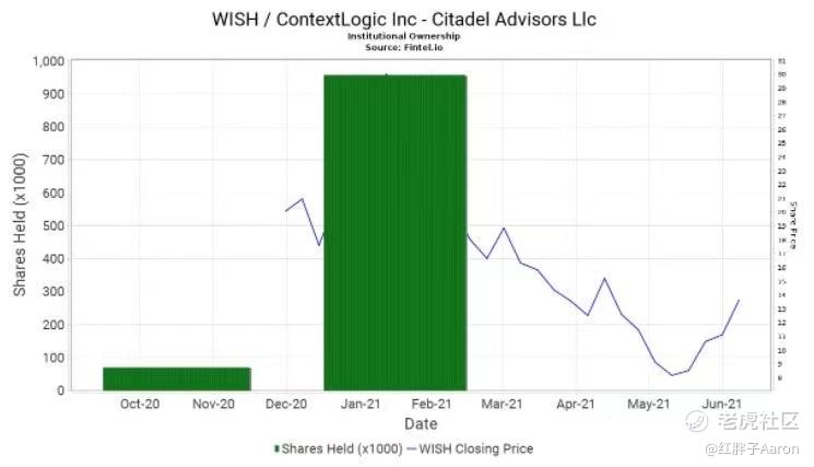 上个月,Citadel Advisors Llc于 2021-05-21提交了一份 13F-HR/A表格,披露了 其在 WISH 957,396股股票的所有权,在几个月前的 2021-03-31,其总持股价值已经高达 15,127,000美元。 Citadel 曾于 2021年 2月 16日提交了一份先前的 13F-HR,披露了 其持有的 WISH 69,838股股票,价值 1,274,000美元,这代表了本季度 1,270%的持股变化。然而,Citadel也有以股票期权的形式在基础证券 WISH 的衍生品中建仓的历史。该公司持有 127,400份价值 2,013,000美元的看涨期权和 205,100份价值 3,241,000美元的看跌期权。