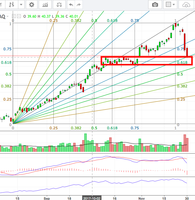$(MU)$美光昨天基本没反弹,几乎直接补了上次41.86跳空上来的缺口。日线上看,昨天遇到的支撑有两处:前期平台的支撑(红框),以及斐波拉契速阻线0.618的支撑。虽然日线级的MACD和OBV显示了回调的态势,但是我认为在基本面没大变化的情况下,由于短期跌幅较大,再深跌的可能性很小。如果进入红色框区域(40-42),开始考虑开始小幅建仓。另外,周K目前依然健康。所以,今天开始可能会有触底反弹的过程。由于这两天都是放量下跌,反弹的力度可能有限。V型反转的可能较小。目前来看,应该是有机构短期大幅度减仓,可能是为了调整仓位到金融板块上。
