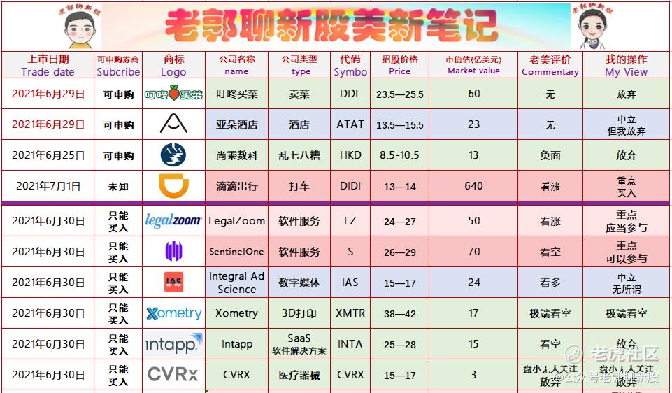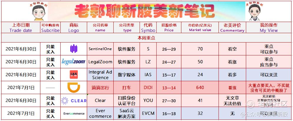好,让我们关注起来,以DIDI为首,S为辅,开展本周的IPO活动吧,简单来说30号和1号又要熬夜啦!