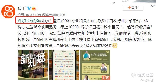 前段时间快手$快手-W(01024)$ 举办了一次新知来了线下活动,更打造了一档泛知识类的栏目“快手新知”,集结了百位文化名人,近日更是推出了“快手新知播”活动。