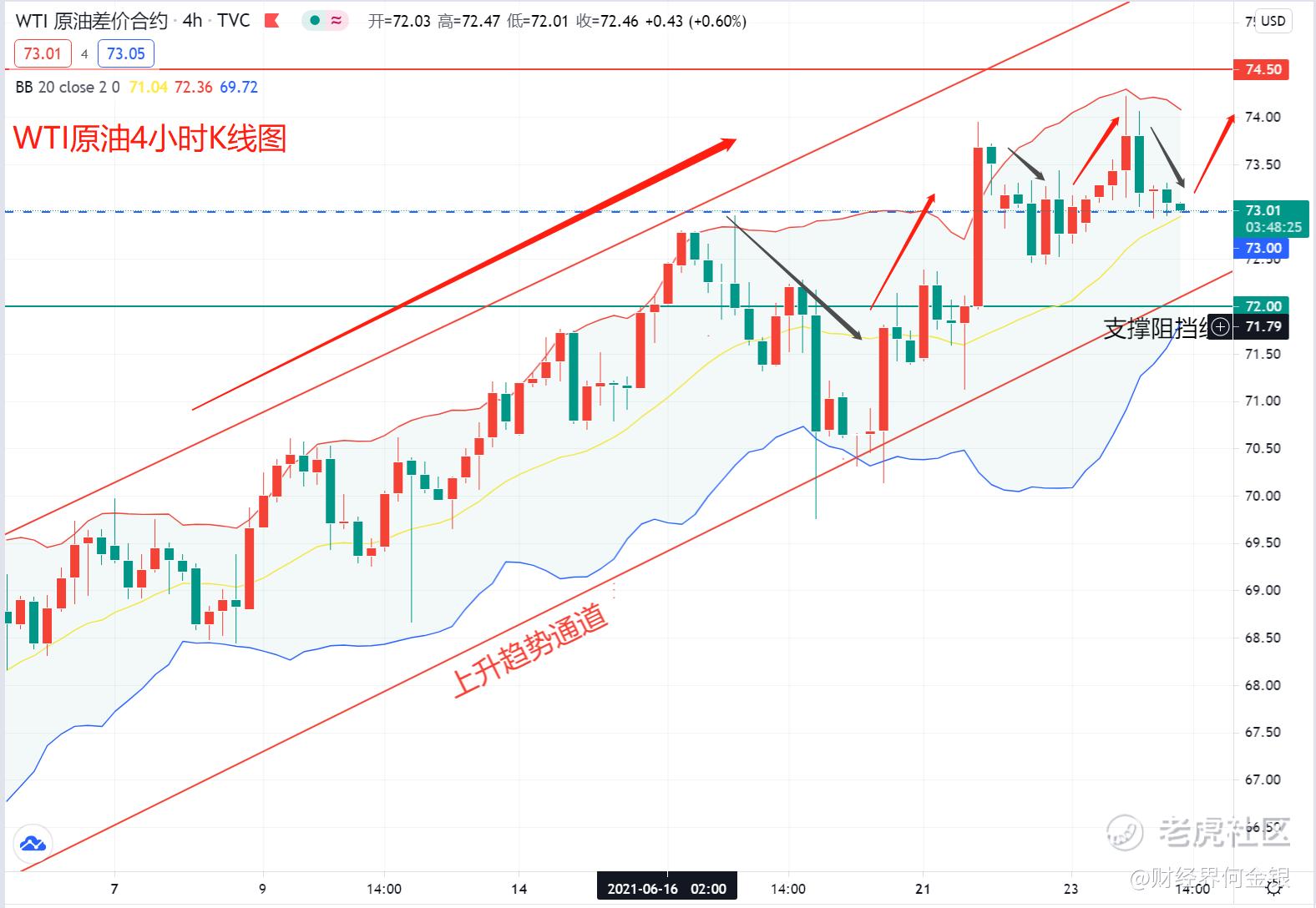 随着原油价格的进一步抬升,原先的支撑阻挡线的作用也就不再适用,因此我调整了支撑阻挡线的位置,在72-73点位置为原油多头行情的支撑区域,适合逢低开立多单,而74.5的位置为原油的多头行情的阻挡区域,适合开立短线空单吃小回调。
