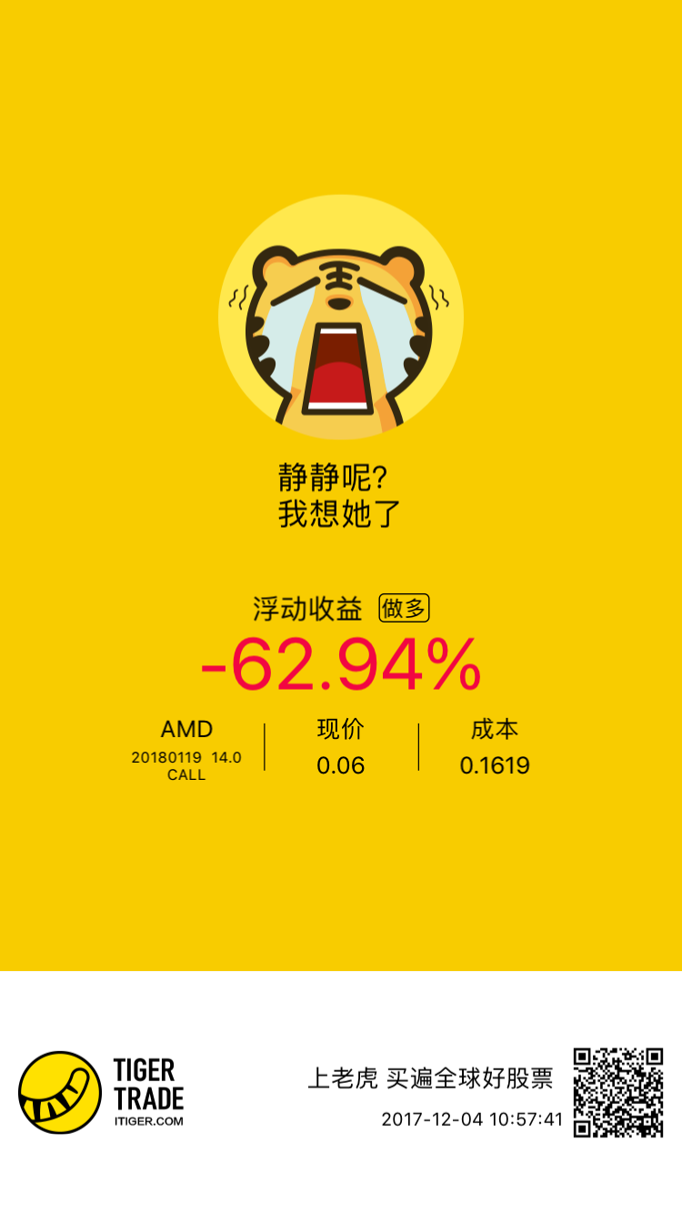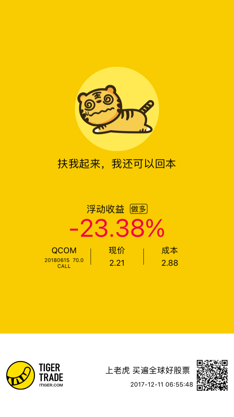 #2017投资大复盘#今年股市行情非常非常好,但是我个人收益很不好,不太稳定,收益率就不公布了,反正上次差点被 $amd$ 弄死了。此时我的心情其实如下图我的一个高通仓位:
