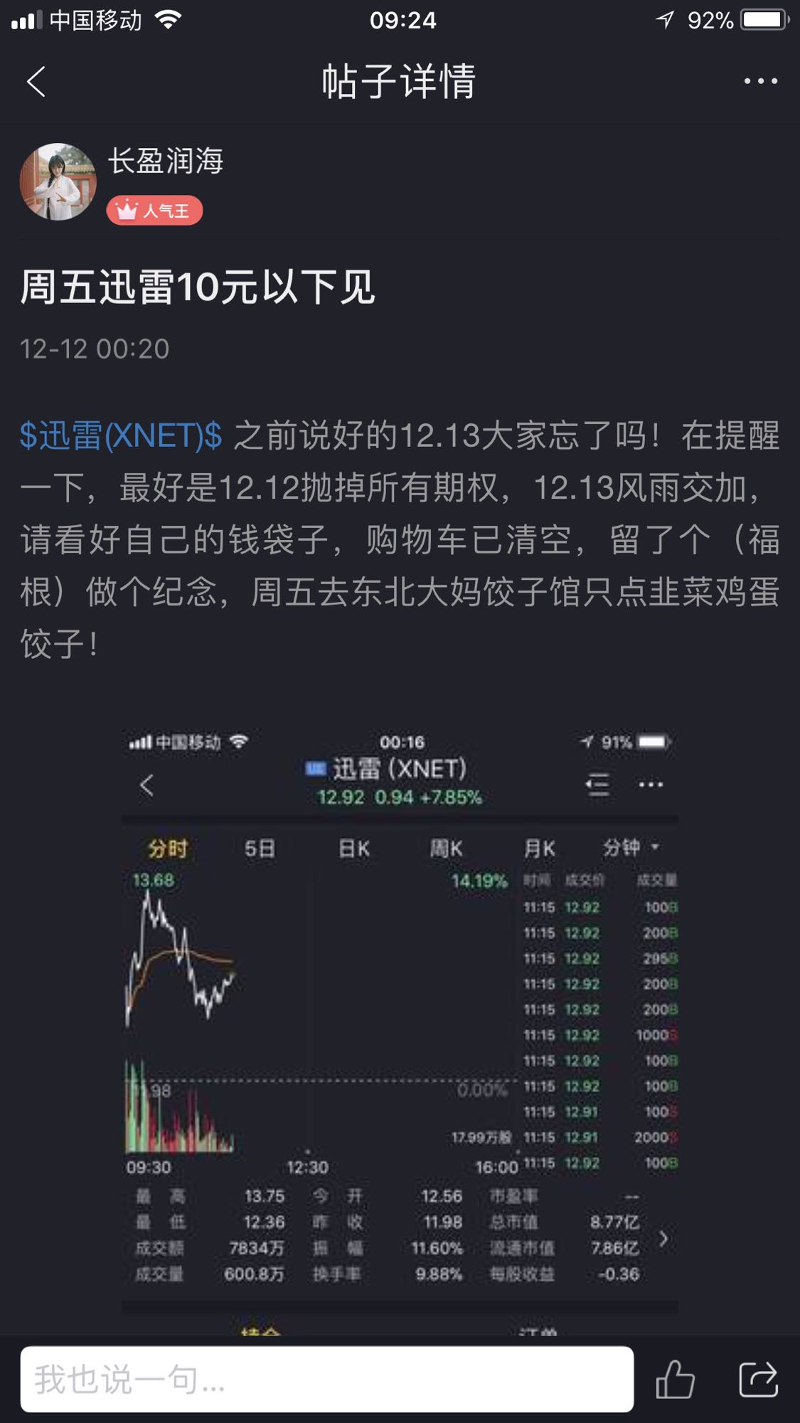 $迅雷(XNET)$ 我之前发了两个帖子让大家1213时抛掉期权,最好是12号、13号见好就收,如果昨天能在高点抛掉,那祝贺你们了,在想大赚的时候不忘大亏才是根本!今天可以再告诉大家一个时间点15号临收盘前可适当建仓,记住幺:礼拜五晚上,也就是礼拜六凌晨3:50见!祝大家安安全全发大财!