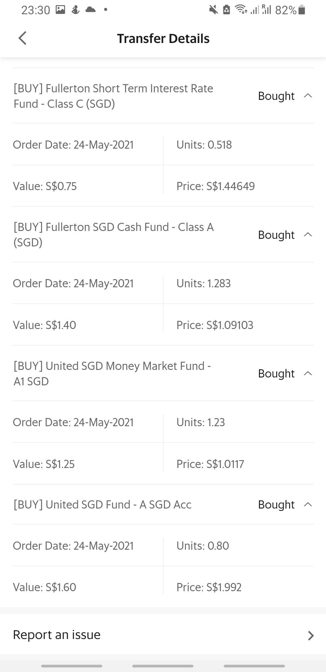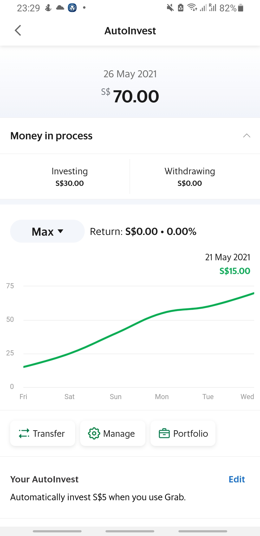 短短的5天中,Grab已经从我的电子钱包扣了$70去GrabInvest了。虽然实际上只有$40买入相关基金单位,其它$30还在等待买入。不得不说这个实在是非常适合小资金也想投资的人,虽然外面也是有同样的基金不过最低也是要$100投资额,而GrabInvest最低只要$1就可以投资了。虽然我觉得一年0.45%的收费是有一点高,毕竟外面的货币市场基金收费都很低,不过可以小额购买基金是算蛮吸引人的。如果新加坡用户可以使用闲钱管家的话,我应该就不会用GrabInvest了,毕竟它们的收益蛮悲剧的,大概就1.18%一年吧。。。[喷血]