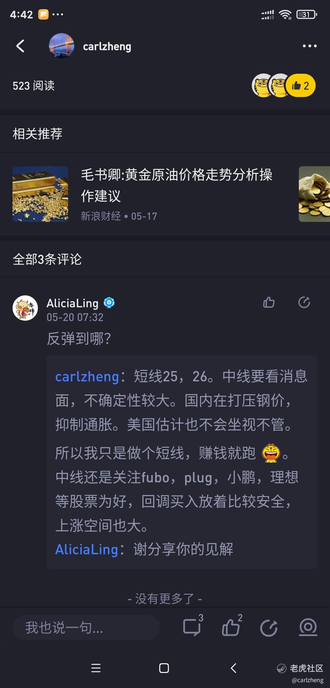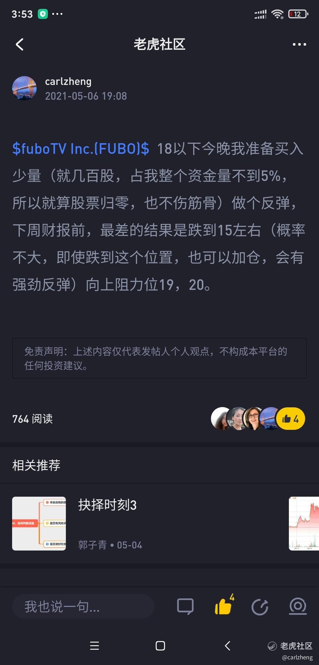 fubo从14.64,到最高22.28,涨幅超过50%。我在5月6号就指出,fubo可能会调整到15元左右,财报前最差也就是15元左右,被我不幸言中,当时很多虎友还不敢抄底做反弹。