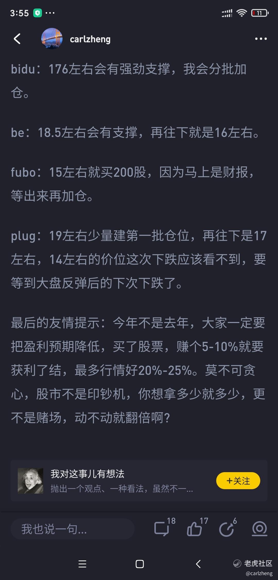 plug最有意思,5月11日下午我刚发完的帖子,说本轮下跌最多到17元左右,晚上盘前就到过17块多,(我17.57加仓了,因为19左右也分批买了),常规交易时间最低价是18.47。到上周五收盘价27.89,九个交易日,也是涨幅超过50%。