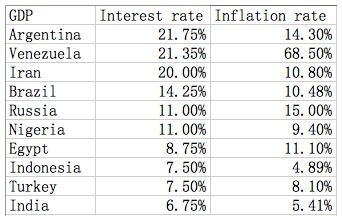 大家可以看到,除了利率外,我同时列出了“通胀率”的数据,原因就在于这两个数据有时候相互牵扯。看看这几个高利率的国家,通胀率其实都不低,我们知道,通胀本身就是一种流通货币过量,或者实际价值下降的表现,那么遏制通胀的重要手段就是收紧银根,即加息了。有时候,对于一国政府来说,这很矛盾,比如巴西,经济本身处于衰退,按理说需要刺激经济,但是当前国内面临的却是通货膨胀局面。对于全球大部分政府,特别新兴国家政府来说,往往对通胀的担心要高于通缩,原因也很简单,恶性通胀导致国民购买力急剧下降,甚至处于“日子没法过”的状态,这种情况下,社会必然不稳,而维护社会稳定是政府的重要职责,所以当经济衰退和通胀一起来临,一般都是加息遏制通胀先。