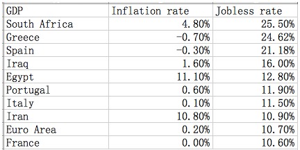 接下里,再看看另一个重要的数据,失业率,这个大家都很容易理解了,失业的滋味一定不是爽快的。失业率常常是一个国家经济现状的直观体现,即它是一个结果,一个国家的经济发展已经无法给予其适龄劳动人口以充分的就业,这种情况常常与通缩相伴。让我们看看近期这方面比较严重的国家: