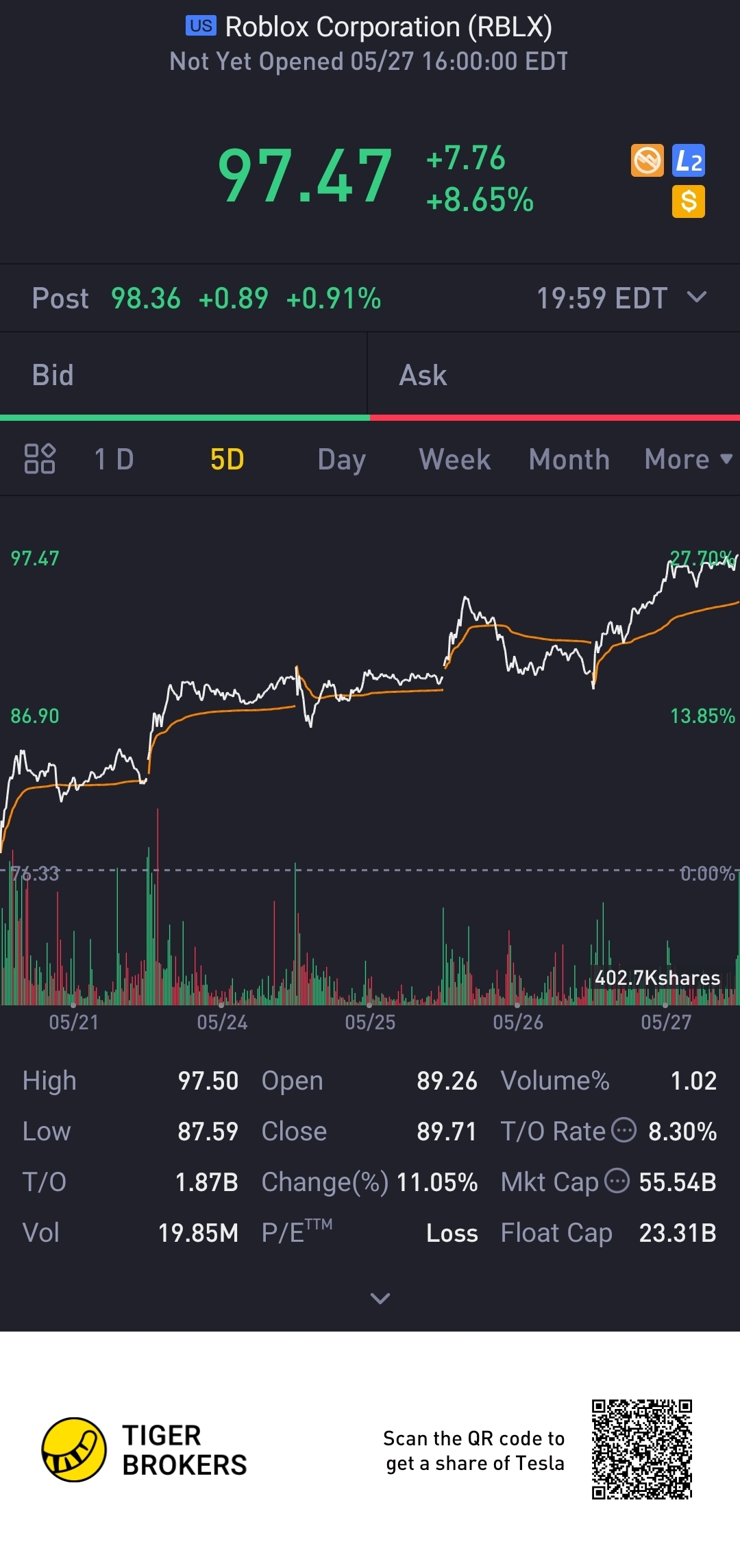 $Roblox Corporation(RBLX)$ heart bleeding to see this as I sold them at $75 [流泪] [捂脸] [喷血] 算了我又不是巴菲特[生气]