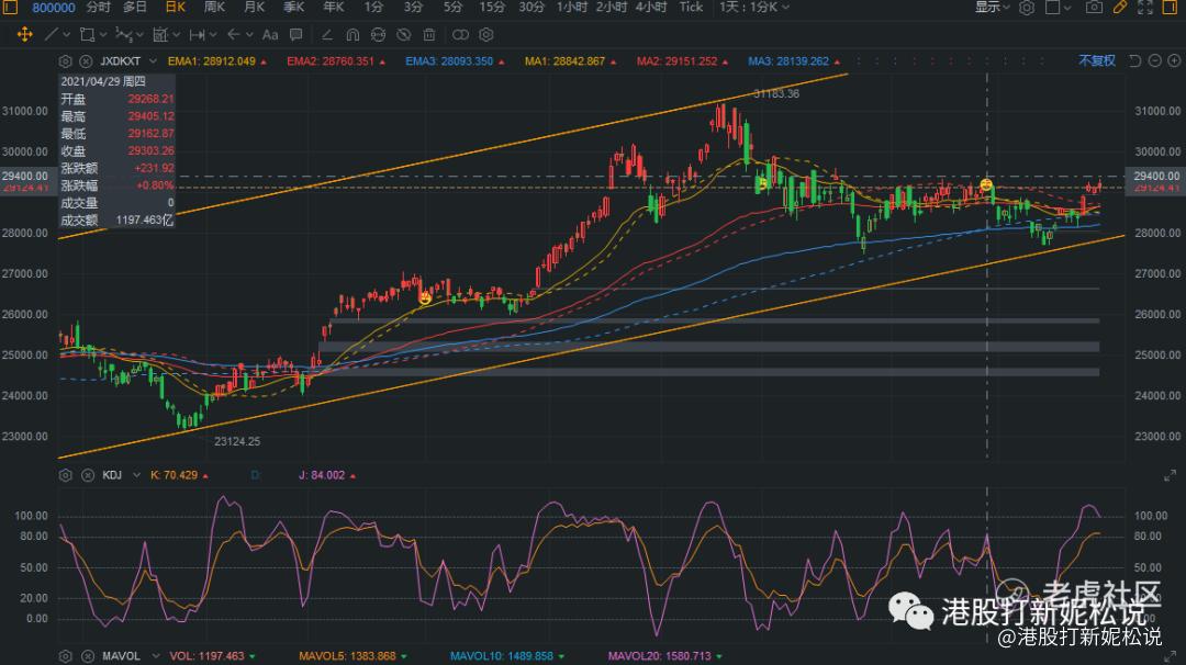 目前恒指到了29400点的压力位置,如果短期无法突破,存在回探28750支撑位置可能。目前由于京东物流首日行情太差,715倍申购,8%一手中签率,结果被散装国配砸到涨幅只有3.32%