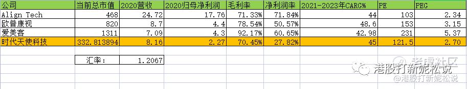 考虑到隐形矫治行业高速增长态势明确、公司竞争优势突出,未来发展景气度较高,预测公司2021年的净利润增速在45%,由于欧普康视、爱美客与时代天使差不多营收,但是时代天使的净利润率明显要低不少,而爱美客明显处于高估的状态,所以按照Align和欧普康视的平均值2.7PEG、121PE来估算,预测为332.8亿港元为现对合理估值,看机构给予市场多少的水位。