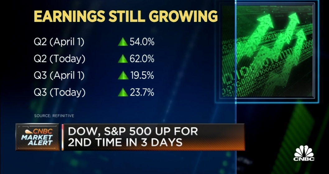 What it means is this: Back in April 1st, Q2 and Q3 forecast were 54% and 19.5%. However as the reopening economy are happening, companies came forward to update their forecast higher. You can see the latest update this week for Q2 and Q3 forecast were 62% and 23.7%. That's like telling the market after one month, my earning will grow even more about 8% in Q2 and 4.2% in Q3.