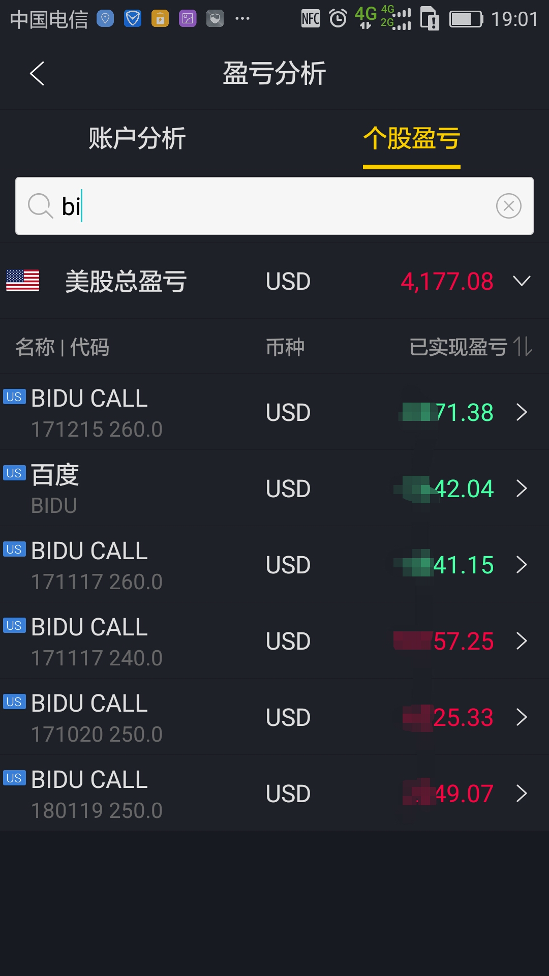 还有一只操作比较多的是百度(包括百度期权)。百度也是比较有争议的公司,但我看好后几年它的发展(人工智能、自动驾驶、与华为战略合作、有传统业务提供现金流等等),但百度形象不好,很多人不喜欢,我觉得在这有争议的时期才是买入机会。经过观察一段时间后才进入(时机有点晚了),后面操作不够理想,多次买入看多期权,整体来说期权盈利、正股亏损。