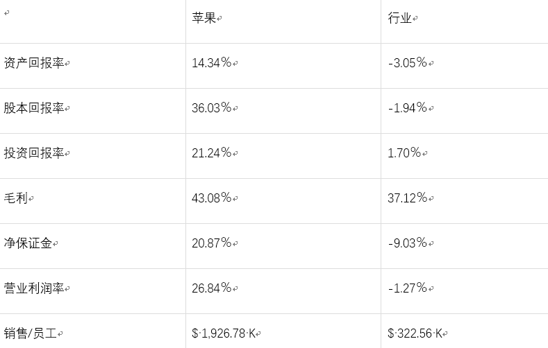 下面的表格比较了苹果和该行业平均的关键盈利指标。尽管许多同行都爬行着挣钱,但苹果在资产回报率(ROA),股本回报率(ROE),投资回报率(ROI),销售利润率等方面都表现得与众不同。