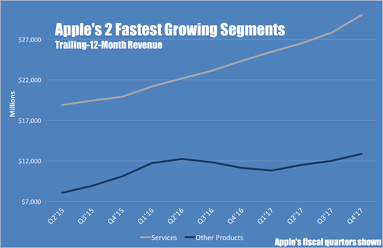 苹果的产品部门正在高速成长,给公司带来了更多收入。服务收入在2017财年同比增长了23%,服务收入包括App Store,iTunes,AppleCare,Apple Pay,许可和其他服务在内。其他的产品包括Apple TV,Apple Watch,Beats产品,AirPods,iPod和配件,上涨约16%。