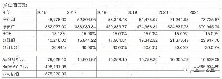 过去十年(07-16年)民生银行的年均ROE在20%左右,假设未来5年年均ROE为15%,分红率30%,以未来5年年均GDP增长率约7%作为贴现率,并对2021的净资产给予1.2倍PB,然后对每年的分红和2021年的净资产进行贴现,然后汇总得出民生银行的合理估值约为5700亿左右。
