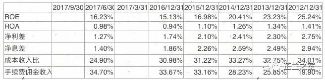 * 从2012年开始,总资产和净资产收益率都处于下行趋势;从14年开始,净利差和息差不断收窄;从14年开始,公司成本收入比不断下降,并稳定在30%左右;从12年开始,手续费与佣金收入占比不断上升,并从15年开始,占到营业收入的三分之一。