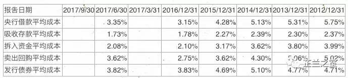 * 最大负债吸收存款的利率从12年开始基本处于下降过程,核心负债发行债券的利率从14年开始处于下降过程;主要负债央行借款的利率从12年进入下行通道,并在17年开始回升,主要负债卖出回购的利率从13年开始进入下行通道,并在17年开始回升,主要负债拆入资金从12年开始进入下行通道。