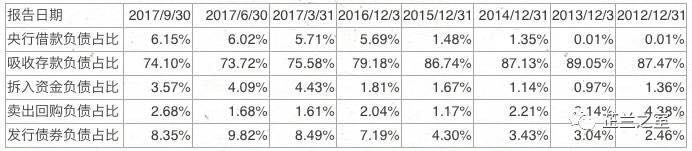 * 从2014年开始, 央行借款负债占比不断上升;从2013年开始,吸收存款负债占比不断下降,但是在2017年第三季度有上升趋势,需要观察,目前吸收存款仍然是占比最大的负债,需要分析占比不断下降的原因是什么?拆入资金负债在2017年一季度开始,占比大幅上升,并在随后两个季度缓慢下降;发行债券的负债占比在2016年大幅上升,并在2017年前两个季度保持稳定增长趋势,在第三季度环比下降。