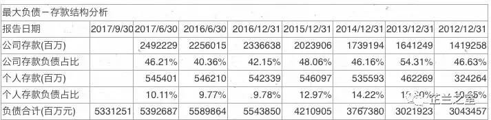 * 最大负债中公司存款从13年开始占比下降,并在17年有明显回升,个人存款从14年开始增长乏力,绝对值维持在5400亿左右,在总负债中的占比一直在下降。