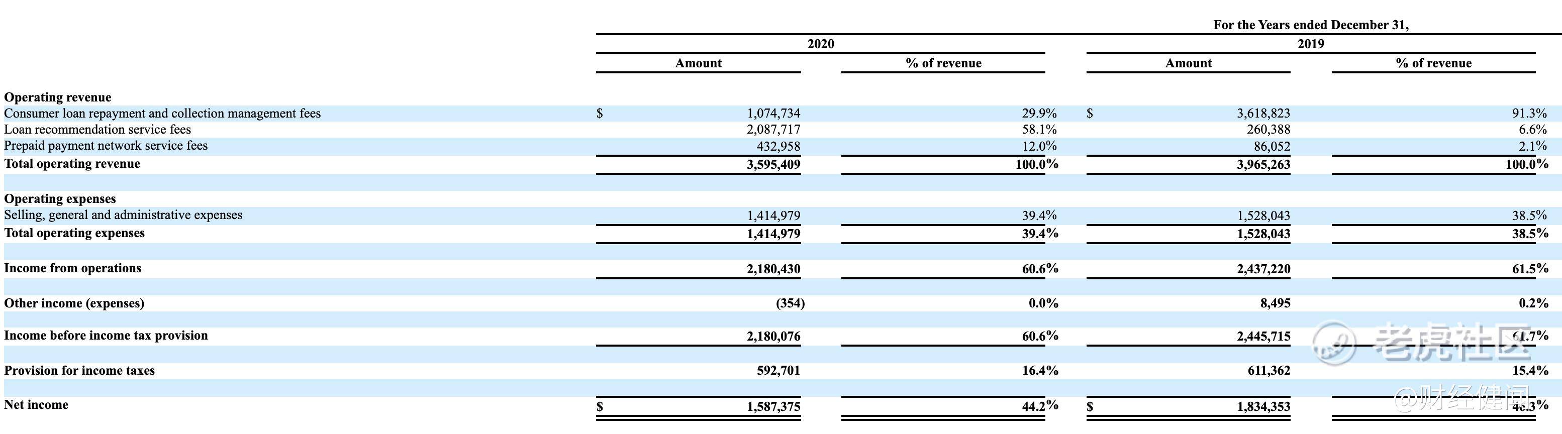 另外,据招股书数据披露,2020年、2019年来自消费贷款还款和收款管理的营收分别为107.47万美元、361.88万美元,分别占总营收的29.9%、91.3%。同期,来自贷款推荐服务的营收分别为208.77万美元、26.04万美元,分别占总营收的58.1%、6.6%。