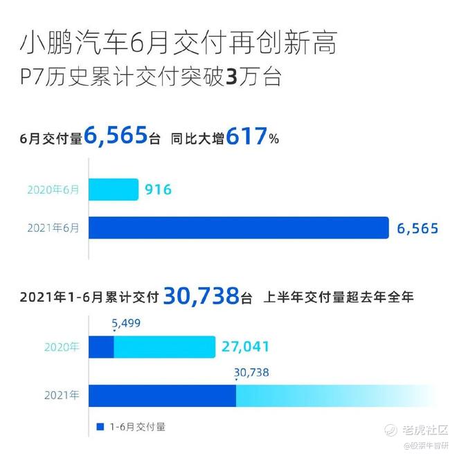 小鹏汽车公布的6月交付量为6565辆,同比大幅增长617%;再看2021年上半年累计交付量达到了30738辆,超过去年全年的交付量,更是2020年同期的5.6倍。单看小鹏汽车二季度交付量为17398台,这也是小鹏史上最强的季度交付成绩。