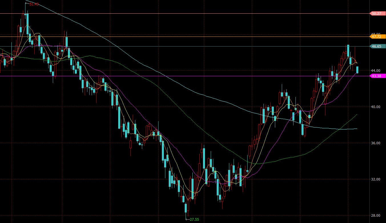 走势上则为头肩顶形态,个人认为后期对应的目标仍在47,突破后看到50。当前支撑在43.4。若非农数据糟糕,则打压美元,助力原油,反之原油将再次考验43.4支撑。