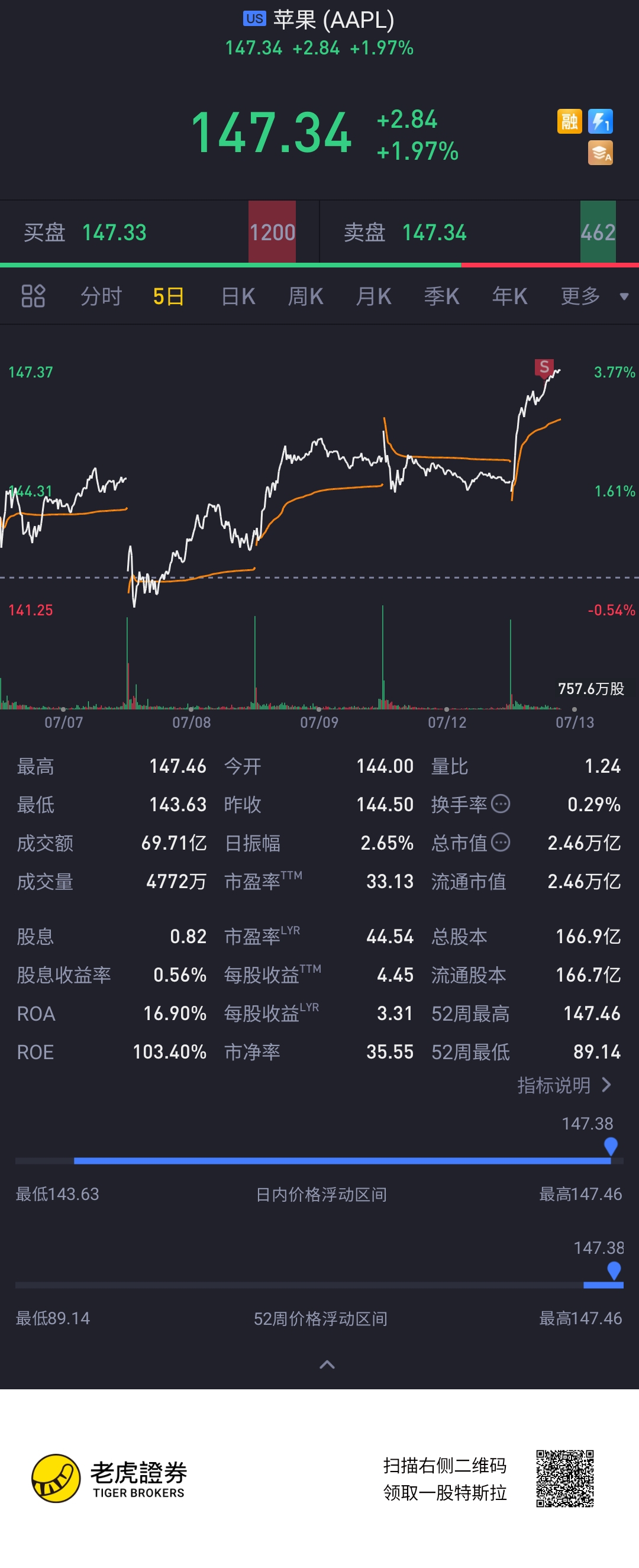 今天苹果突破每股147.46 , 继续加油吧↖(^ω^)↗