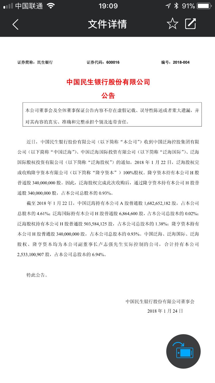 泛海出手!民生银行有戏!?一个长期影响民生银行股价的东西就要拨开云雾见天日了? 静静的看明天的好戏,价值的回归有时候就是需要一个催化剂!也许,明天可以见分晓!价值会迟到,但是不会不到!@Tony特别帅 @爱发红包的虎妞 $民生银行(01988)$