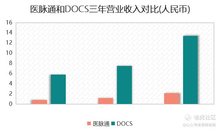 三年的营业收入,医脉通是DOCS大学六分之一的SIZE。
