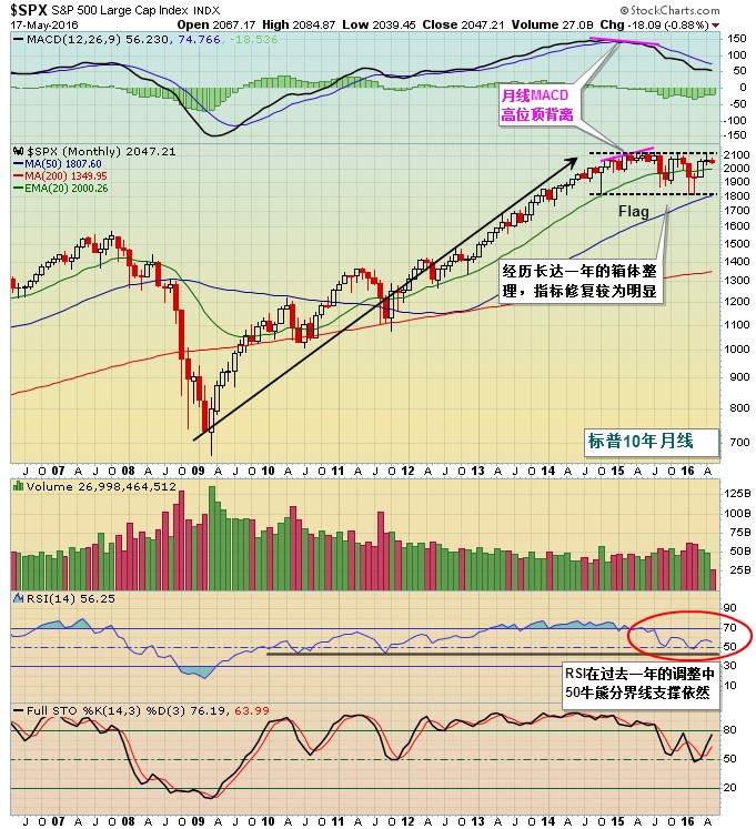 标普的历史高点是2015年5月21日创造的2131点,此后月线正式进入长达一年的箱体整理。(标普昨收2047,算下来过去近一年下跌84点,约4%)