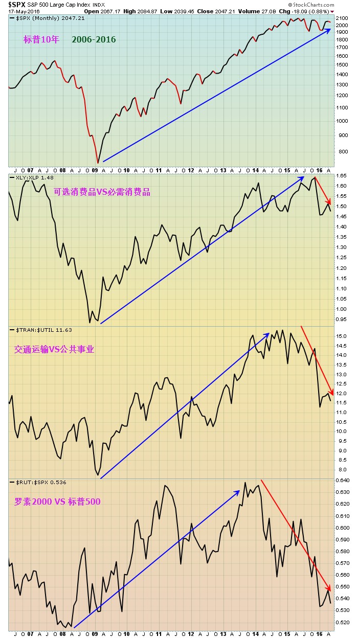 图中对比了标普指数以及各风险板块和其相对应防御性板块10年以来各自表现情况。