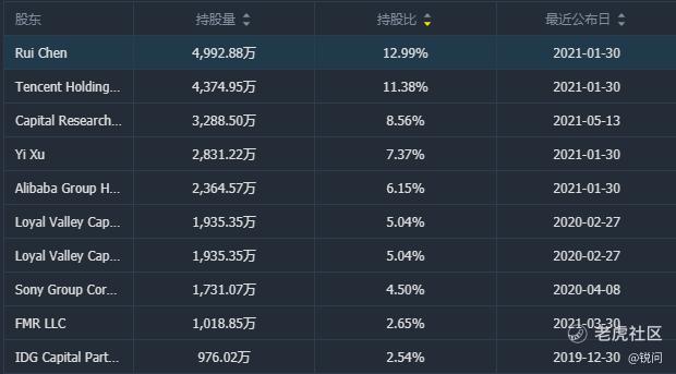 B站持股比例排名前十的股东 来源:Tiger Trade