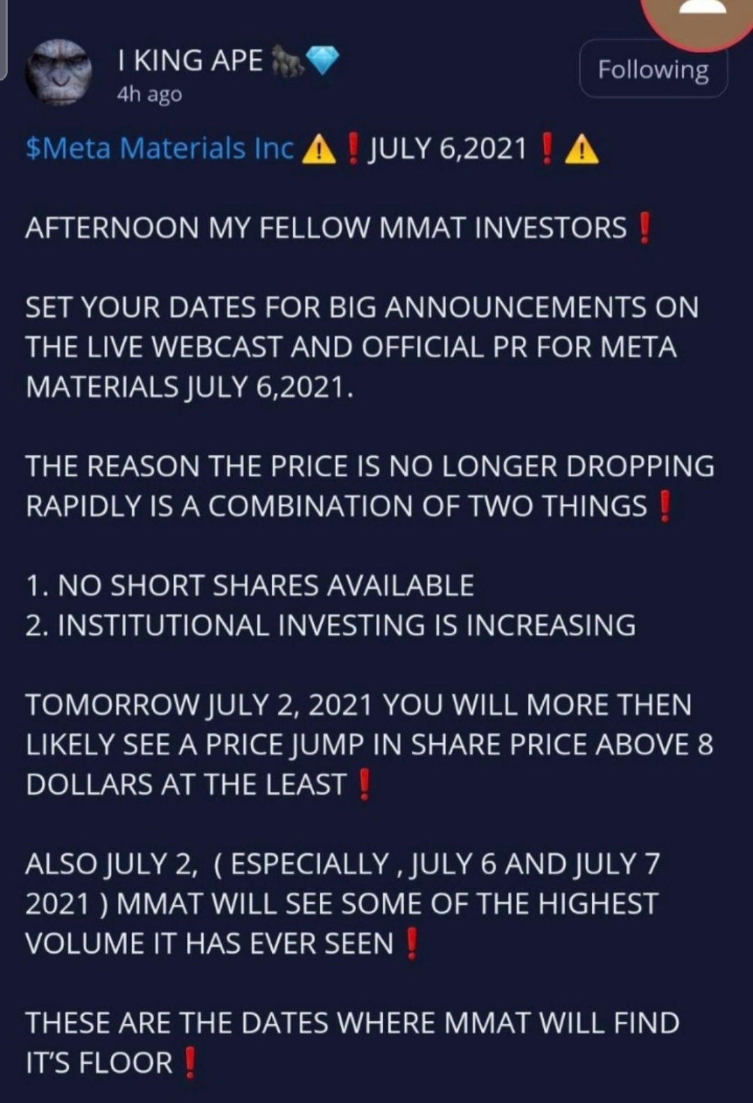{"i18n":{"language":"zh_CN"},"detailType":1,"isChannel":false,"data":{"magic":2,"id":156587265,"tweetId":"156587265","gmtCreate":1625230741157,"gmtModify":1631884924860,"author":{"id":3543360252990222,"idStr":"3543360252990222","authorId":3543360252990222,"authorIdStr":"3543360252990222","name":"Sunmi","avatar":"https://static.tigerbbs.com/9d876feae85a19464db5378bff465d79","vip":1,"userType":1,"introduction":"","boolIsFan":false,"boolIsHead":false,"crmLevel":12,"crmLevelSwitch":0,"individualDisplayBadges":[],"fanSize":19,"starInvestorFlag":false},"themes":[],"images":[{"img":"https://static.tigerbbs.com/b0ac9ed4f01056add02a61830fbe31da","width":"1080","height":"1581"}],"coverImages":[{"img":"https://static.tigerbbs.com/b0ac9ed4f01056add02a61830fbe31da","width":"1080","height":"1581"}],"extraTitle":"","html":"<html><head></head><body><p><a href=\"https://laohu8.com/S/MMAT\">$Meta Materials Inc.(MMAT)$</a>May the force be with u! Lets Rock!</p><p><img src=\"https://static.tigerbbs.com/b0ac9ed4f01056add02a61830fbe31da\" tg-width=\"1080\" tg-height=\"1581\"></p></body></html>","htmlText":"<html><head></head><body><p><a href=\"https://laohu8.com/S/MMAT\">$Meta Materials Inc.(MMAT)$</a>May the force be with u! Lets Rock!</p><p><img src=\"https://static.tigerbbs.com/b0ac9ed4f01056add02a61830fbe31da\" tg-width=\"1080\" tg-height=\"1581\"></p></body></html>","text":"$Meta Materials Inc.(MMAT)$May the force be with u! Lets Rock!","highlighted":1,"essential":1,"paper":1,"likeSize":8,"commentSize":4,"repostSize":1,"favoriteSize":0,"link":"https://laohu8.com/post/156587265","repostId":0,"isVote":1,"tweetType":1,"viewCount":1049,"commentLimit":10,"likeStatus":false,"favoriteStatus":false,"reportStatus":false,"symbols":["MMAT"],"verified":2,"subType":0,"readableState":1,"langContent":"EN","currentLanguage":"EN","warmUpFlag":false,"orderFlag":false,"shareable":true,"causeOfNotShareable":"","featuresForAnalytics":[],"commentAndTweetFlag":false,"andRepostAutoSelectedFlag":false,"upFlag":false,"length":53,"xxTargetLangEnum":"ORIG"},"commentList":[],"isCommentEnd":true,"isTiger":false,"isWeiXinMini":false,"url":"/m/post/156587265"}