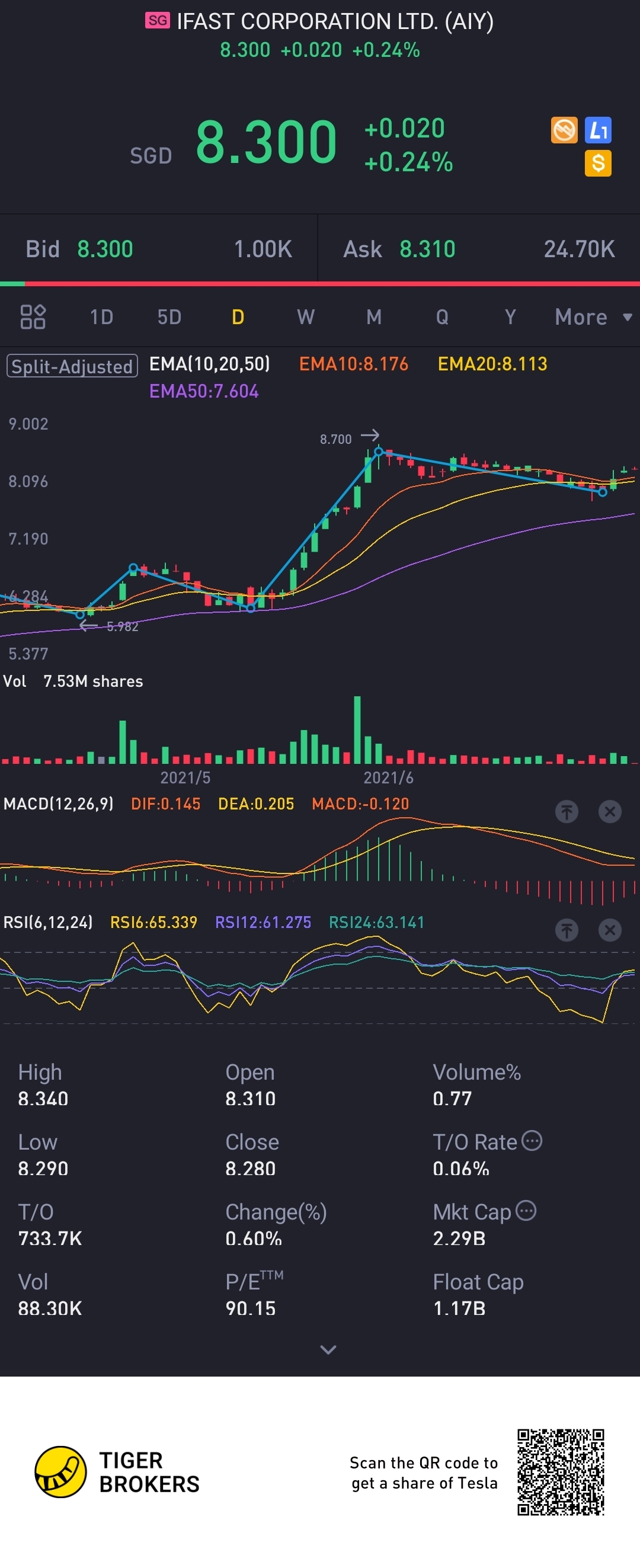 $IFAST CORPORATION LTD.(AIY.SI)$RSI has improved. Hoping for the same for MACD to have a lasting up trend 📈 [开心]