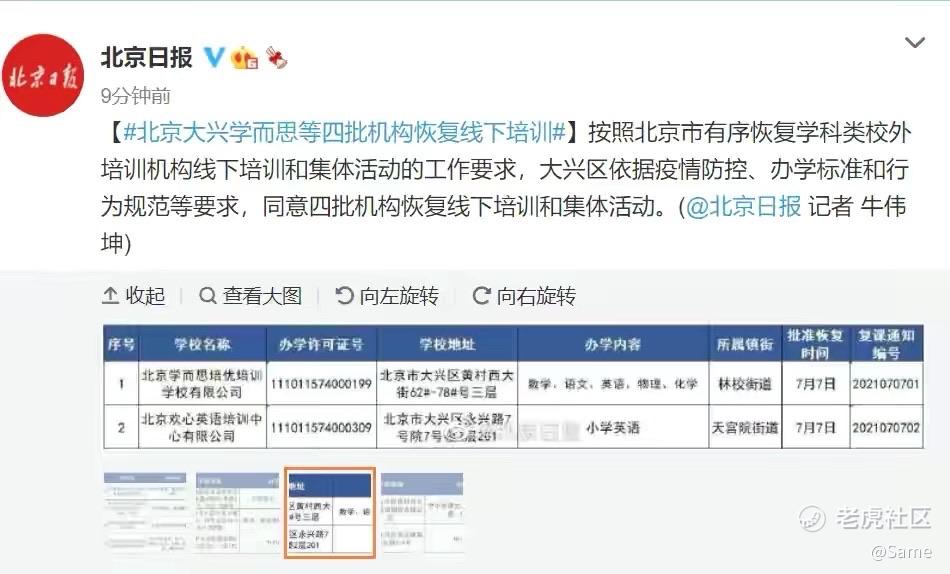 $好未来(TAL)$据北京日报微博今日晚间消息,按照北京市有序恢复学科类校外培训机构线下培训和集体活动的工作要求,大兴区依据疫情防控、办学标准和行为规范等要求,同意四批机构恢复线下培训和集体活动,其中包括北京学而思培优培训学校有限公司,从7月7日起恢复。(北京日报)