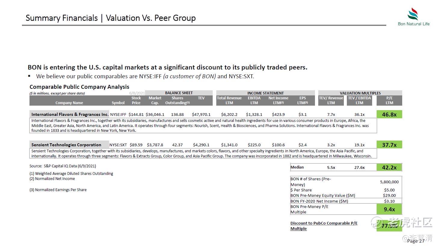 根据公司与6月11日上报美国证监会FWP文件第27页(如下截图)显示,公司在美国同行可比公司市盈率平均值为42.2倍,在不考虑盈利增长速度的前提下,意味着BON公司股价根据美国行业市盈率应为24.48美金 [0.58 (2020财年每股净利润) x 42.2 (行业市盈率) = 24.48美金]。因此也不难理解据知情人士透露公司IPO发行获得3倍以上的超额认购,受到美国价值投资者的追捧。