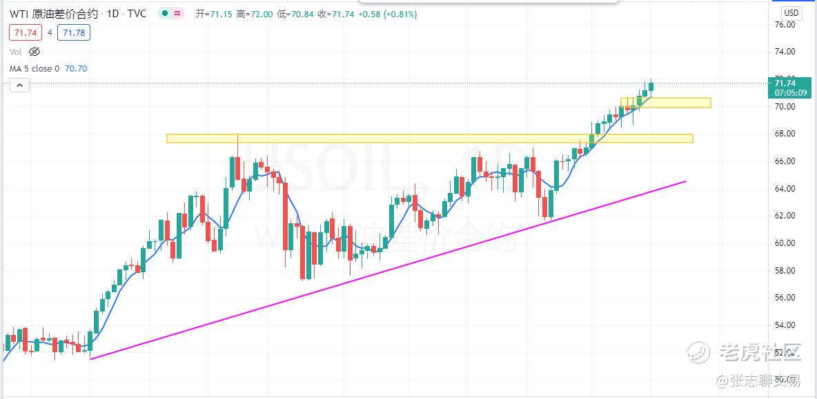 上次讲原油还是一周前,当时提醒大家注意68附近的压力,突破之前谨慎追多,突破后继续看涨至72--74,转眼间72马上就到了,真的是一根筋的原油,涨起来六亲不认。