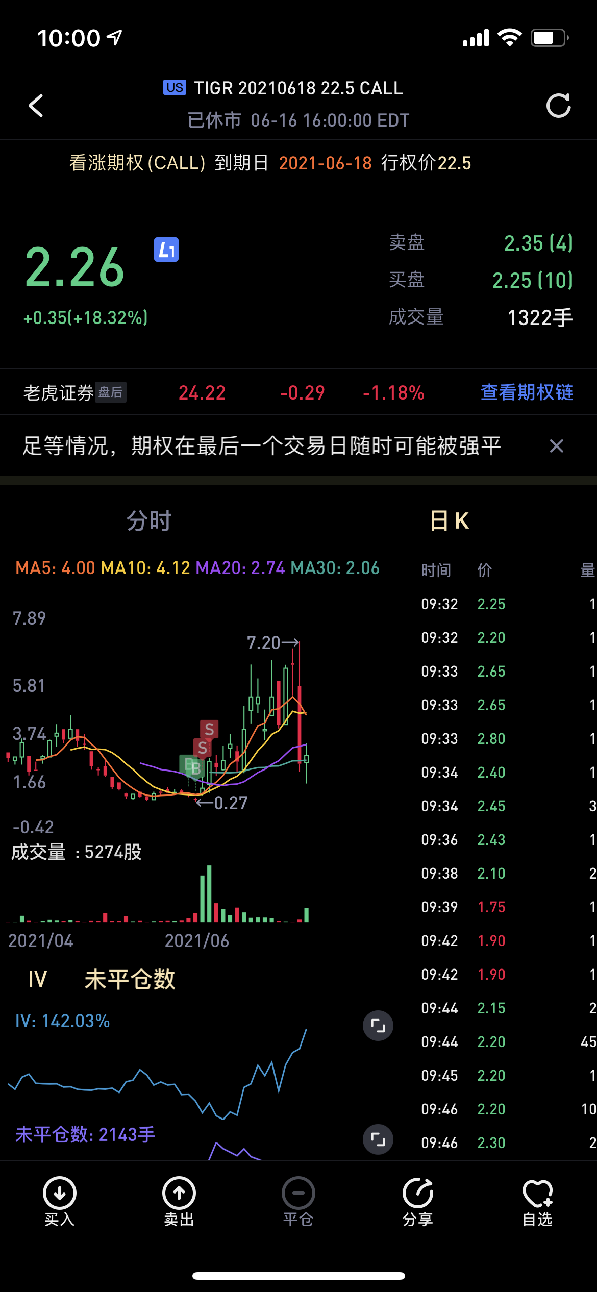 同样的事情还发生在了 $老虎证券(TIGR)$ ,五月份财报的前两天,老虎股价尚处于低位,此时的我早已做了很多研究,阅读了大量的数据和资料,加上对老虎的信仰,我笃定这次的财报肯定惊人。于是我分两次买了三百手22.5的看涨期权,当时的平均成本大概0.35左右。再一次,因为信仰的不坚定,和对市场不稳定的担忧,让我错失了翻二十倍的绝佳机会。