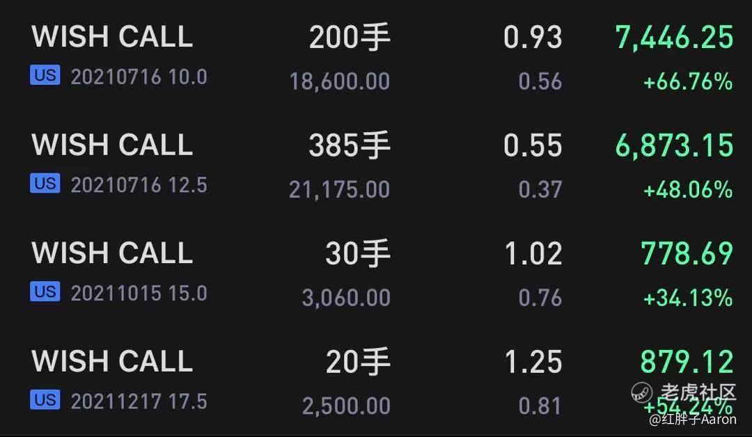 终于轮到了本文的主角$ContextLogic Inc.(WISH)$,在经历过前两次的“踩坑”后,我痛定思痛,心想着这一次再也不能错过良机了。经过大量的研究,我幸运的抢在WSB之前,发现了这只宝藏股票。在它股价最低的时候,我重仓了该股的看涨期权,短期有七月份的,长期有十月份的,以下是我最多时候的仓位,此时还没到爆发的那一晚。