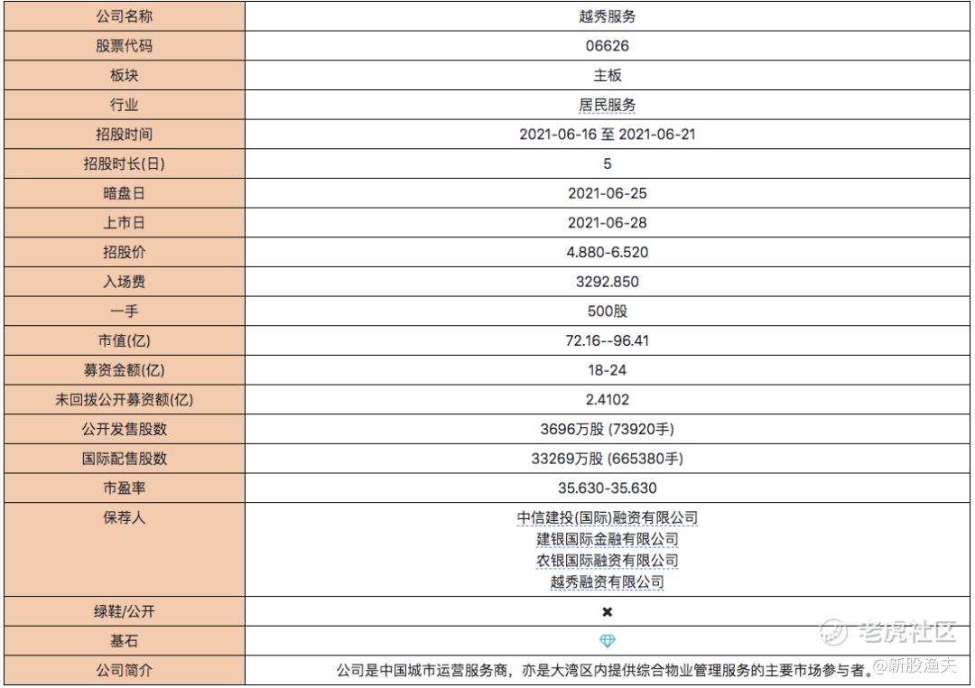 保荐人是2家银行+自家券商+中信建投,主保荐人农银历史业绩平平,属于涨跌幅都不大的那种,除了上市割韭菜的合景悠活大跌和赶上行情大好时发行的网上车市大涨,其余涨跌幅都在10%以内。稳价人为自家券商越秀融资,稳价历史只有一次,不能说明什么问题,这次为自家人护盘,大概会卖力吧。