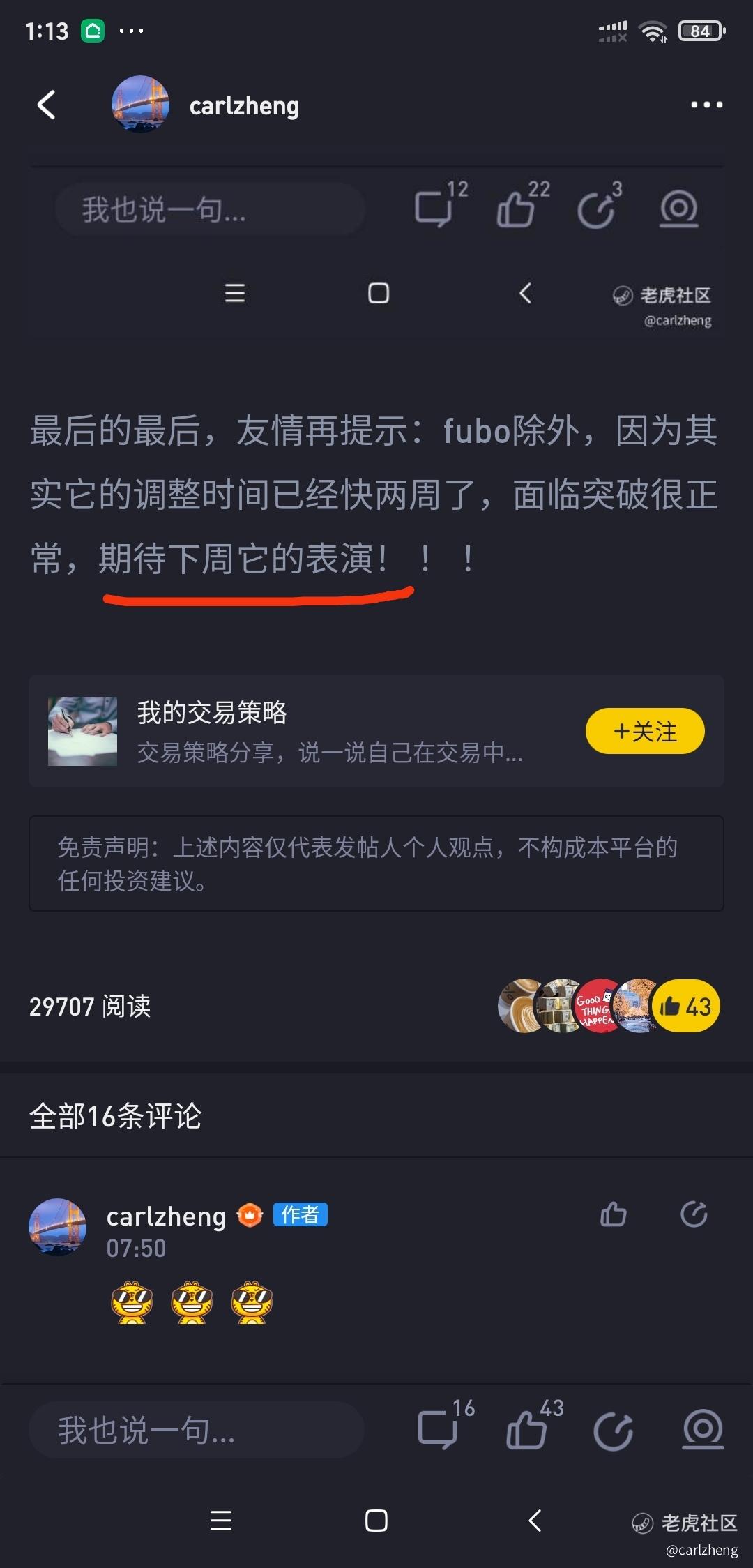有的人可能觉得我喜欢做短线。其实做股票,节奏很重要。不同阶段,要用不同策略。确定性高的时候,可以持股。例如fubo,一直看我帖子的朋友应该很清楚,我从15就开始推荐,18让大家重仓买,20-22那里有一周多的震荡期,我反复提醒大家,拿住喽,千万别掉队。而且我早就提出5月底6月初会有突破,目标25-26,乐观的话29。后来大盘上涨,做多科技股热情暴涨,所以冲到29。后面又是因为基本面发生改变,和LG合作形成重大利好才到了31。我基本踏准了fubo本次反弹以来的每一个节奏,利润基本最大化了。当然如果你资金量大,做些小波段,甚至日间交易,都无伤大雅。这些都是小插曲,bonus。